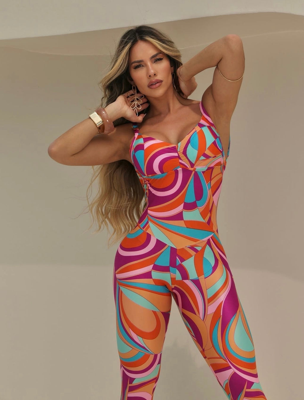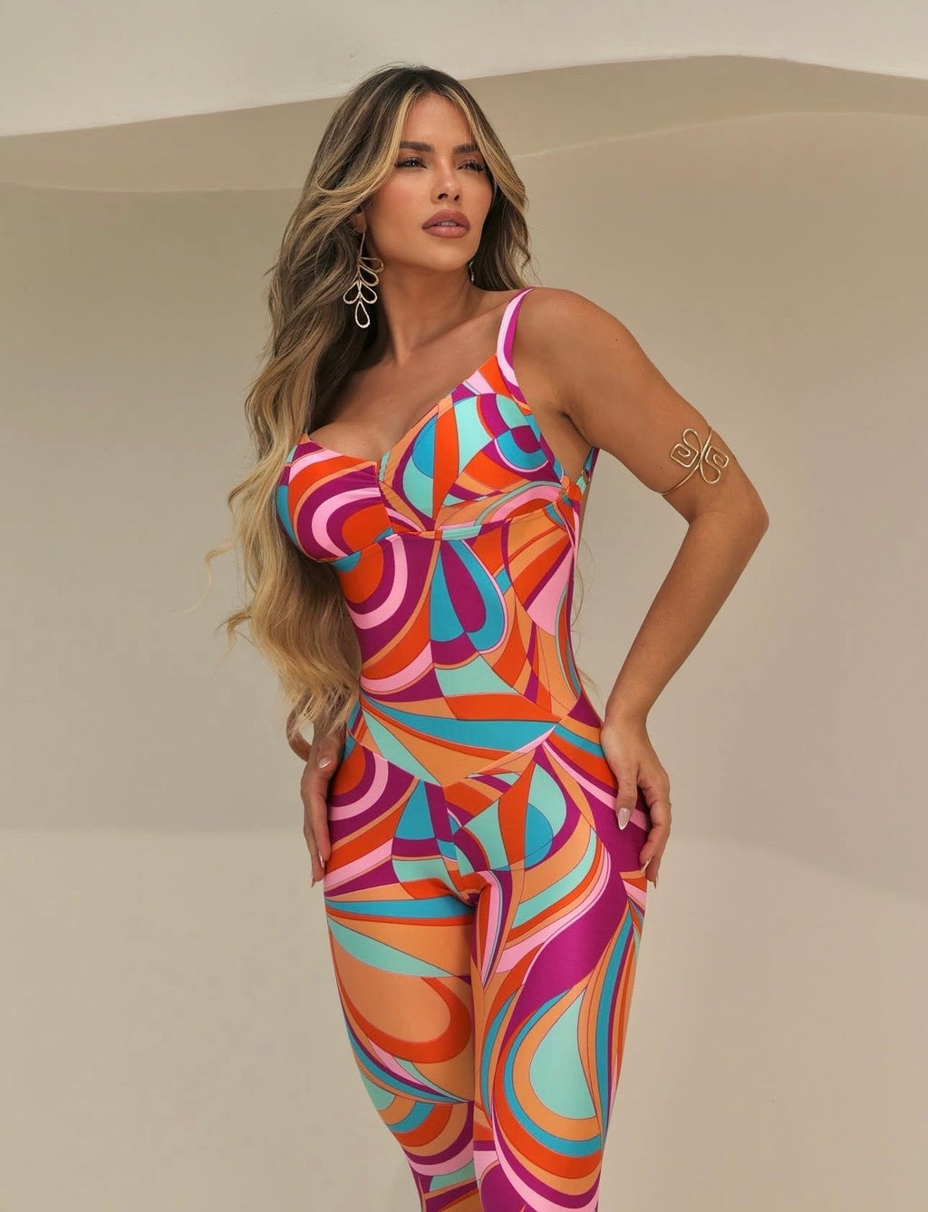 - Tecido: Cirrê estampado brilhoso (90% poliamida e 10% elastano), possui bojo e empina bumbum.