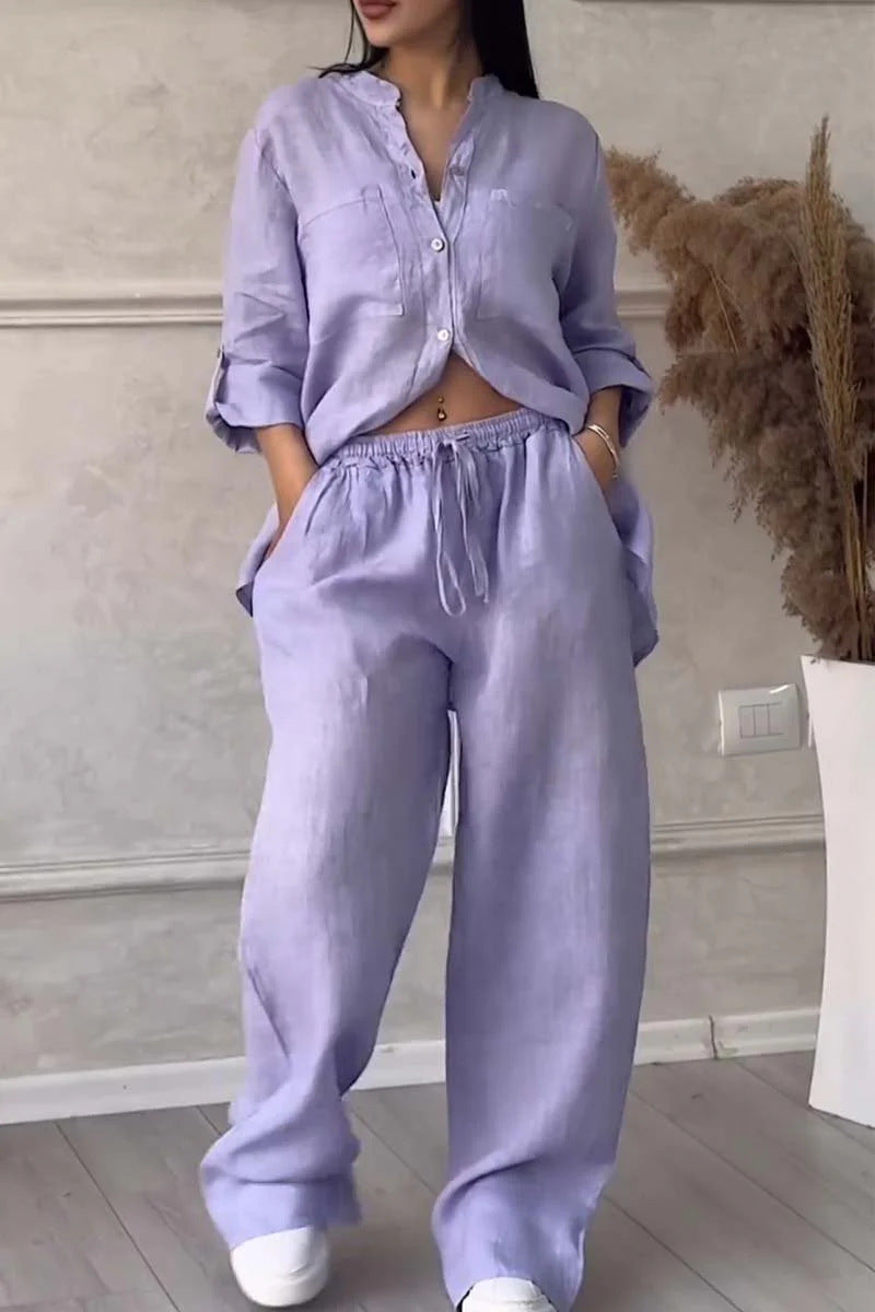 • Detalhes: Camisa oversized com botões frontais e bolsos + calça pantalona com elástico ajustável na cintura.