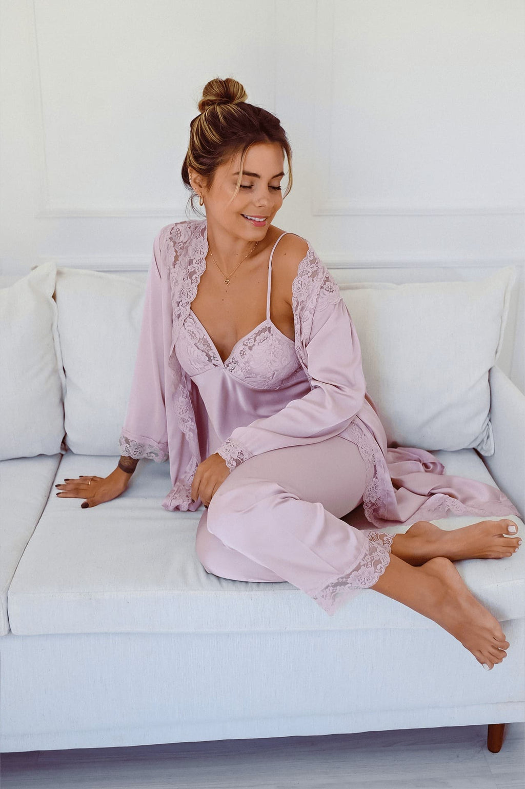 O pijama Angélica é confeccionado em cetim de alta qualidade, proporcionando uma sensação suave e agradável ao toque. Cada peça é adornada com detalhes em rendas delicadas, adicionando um toque de elegância e feminilidade.