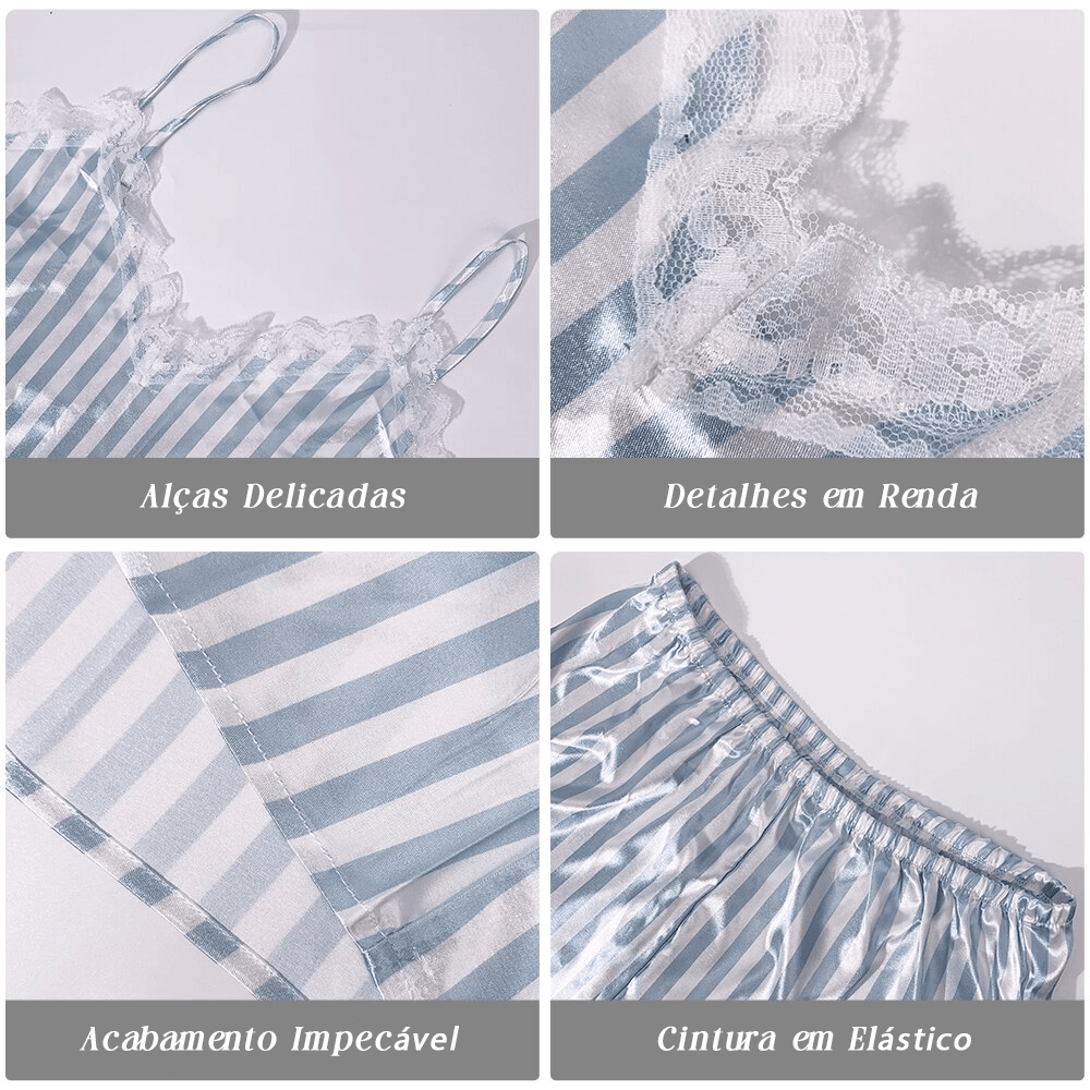 Pijama confeccionado em cetim, com listras e detalhes em renda no decote e no shorts. Super confortável para suas noites de descanso.